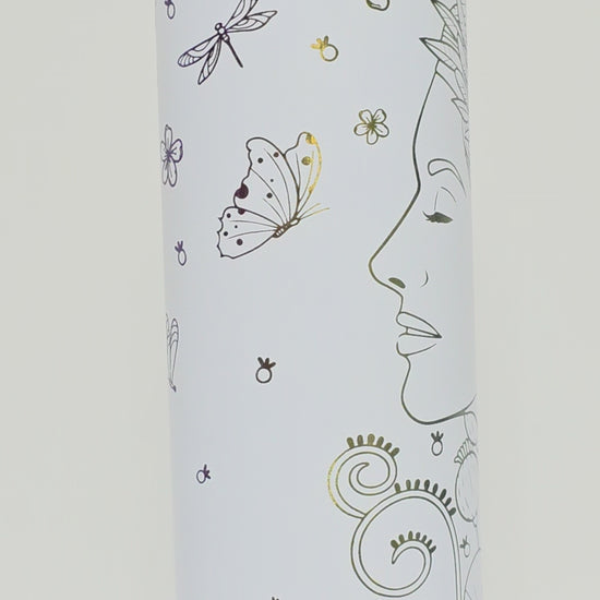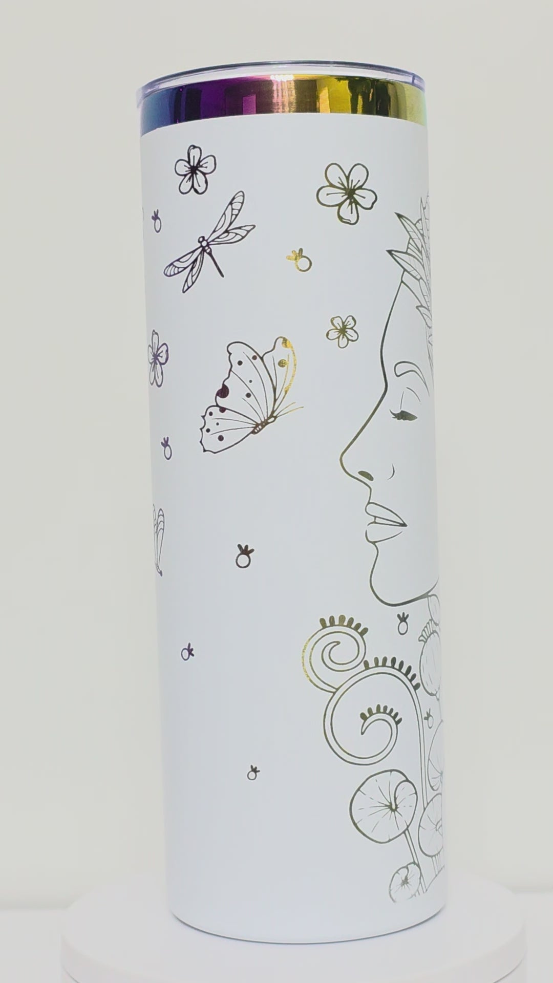 Boho floral stainless steel tumbler featuring feminine face line art, botanical flowers, butterflies, and dragonflies with an iridescent shimmer rim.