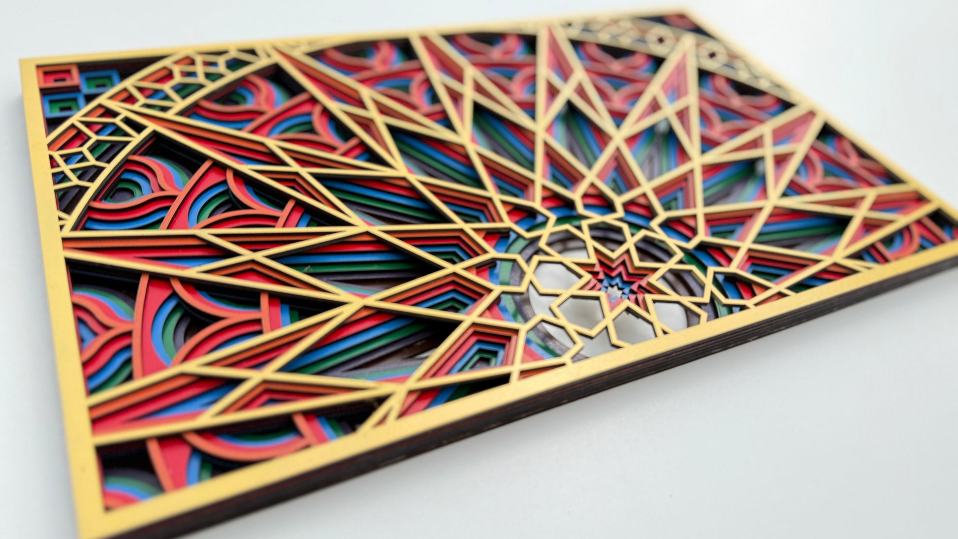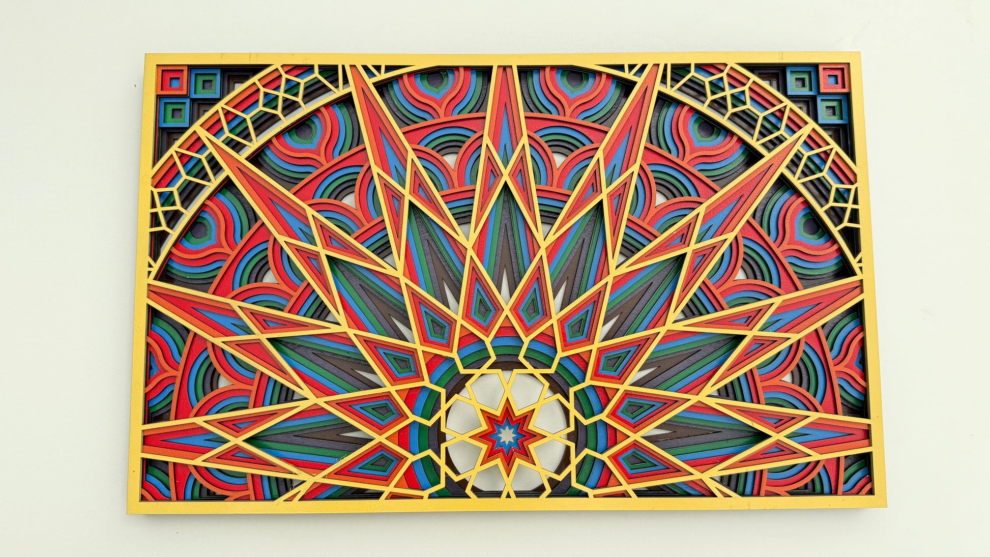 Inspired by the rising sun, this bold geometric design combines 7 laser-cut layers in vivid tones of red, blue, green, and yellow. Every detail is meticulously made as a perfect statement piece for modern homes, studios, or creative spaces.