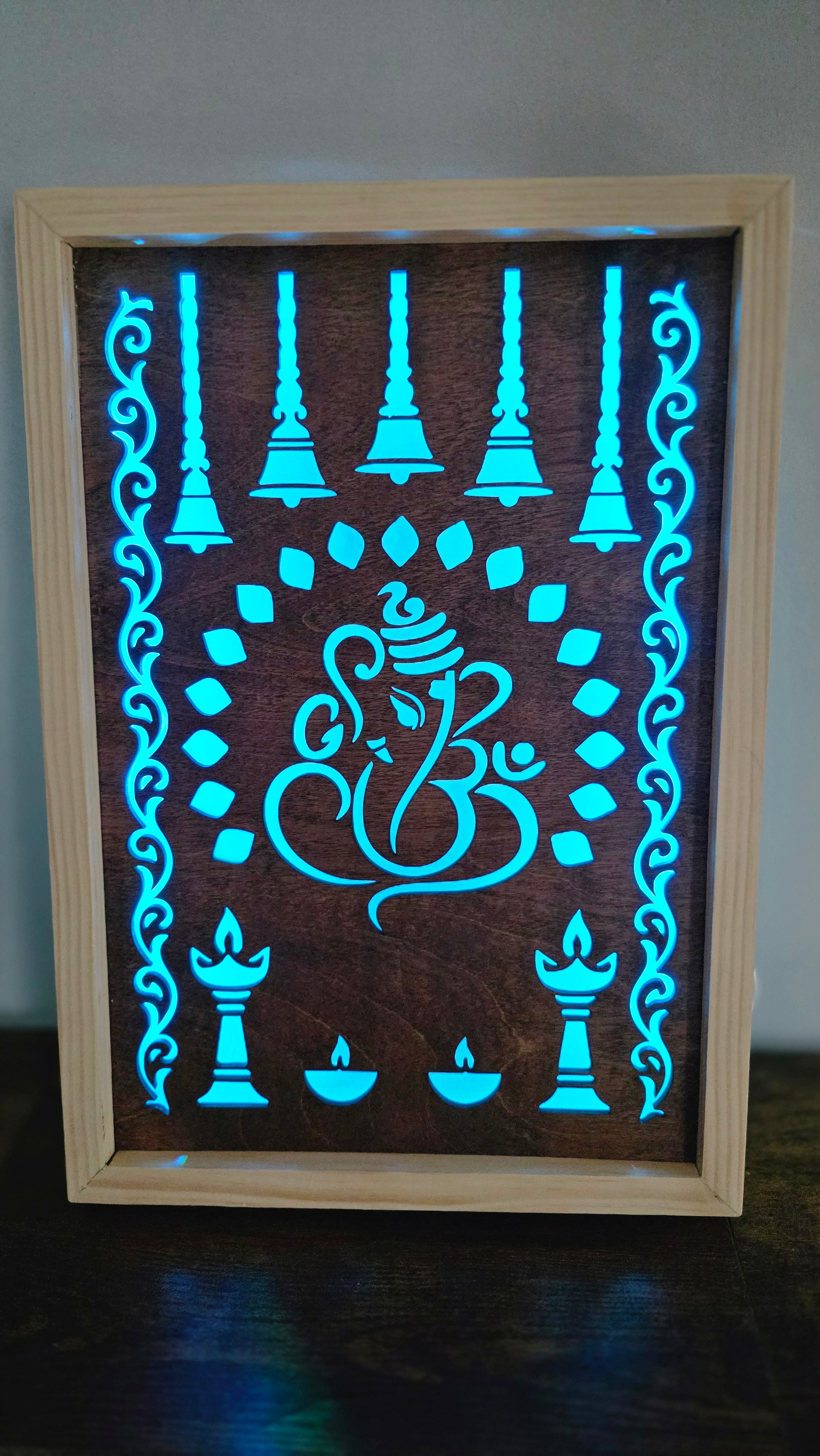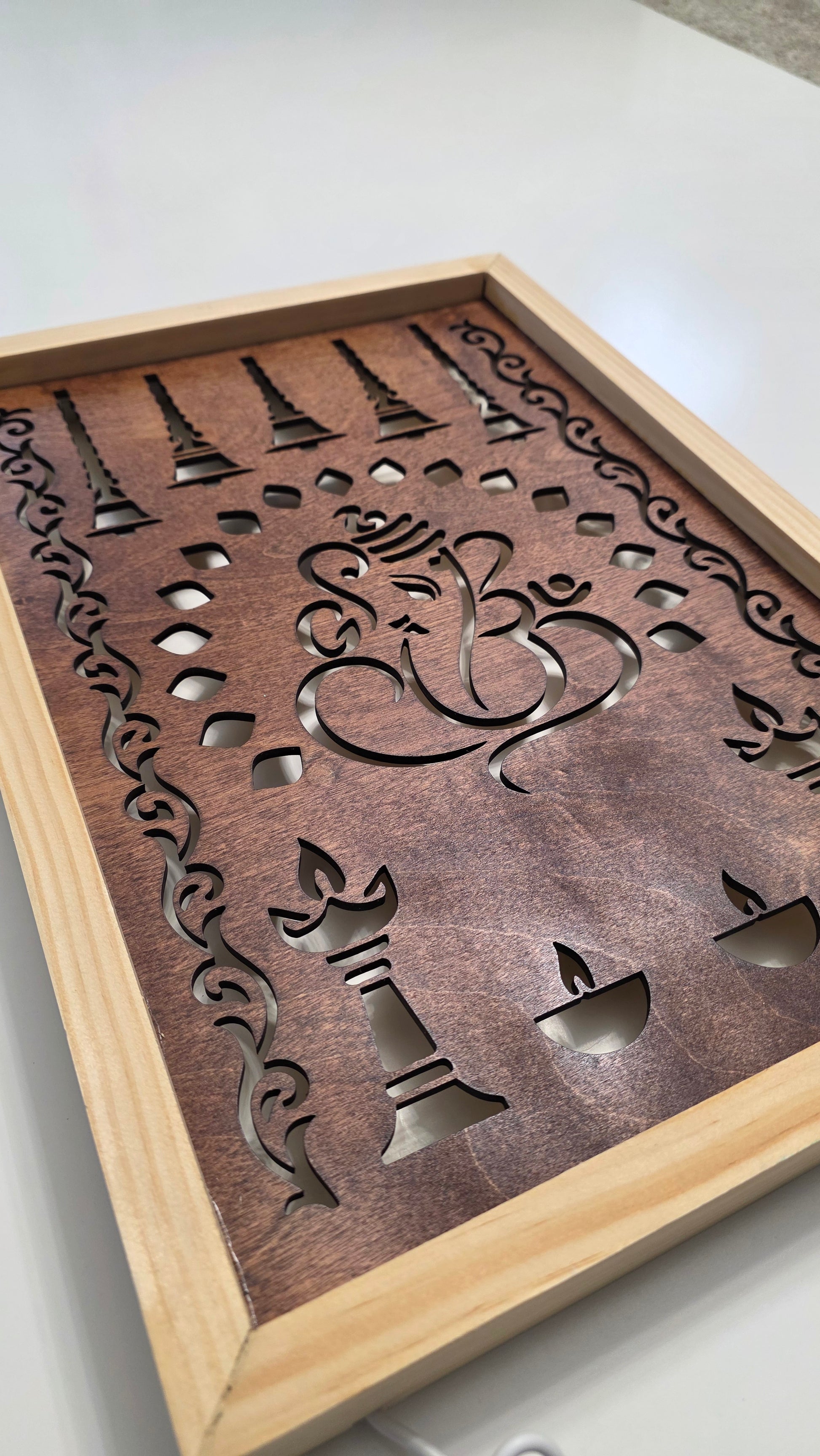 Illuminated Ganesha Wall Art – Handcrafted Wooden Panel with Traditional Indian Motifs