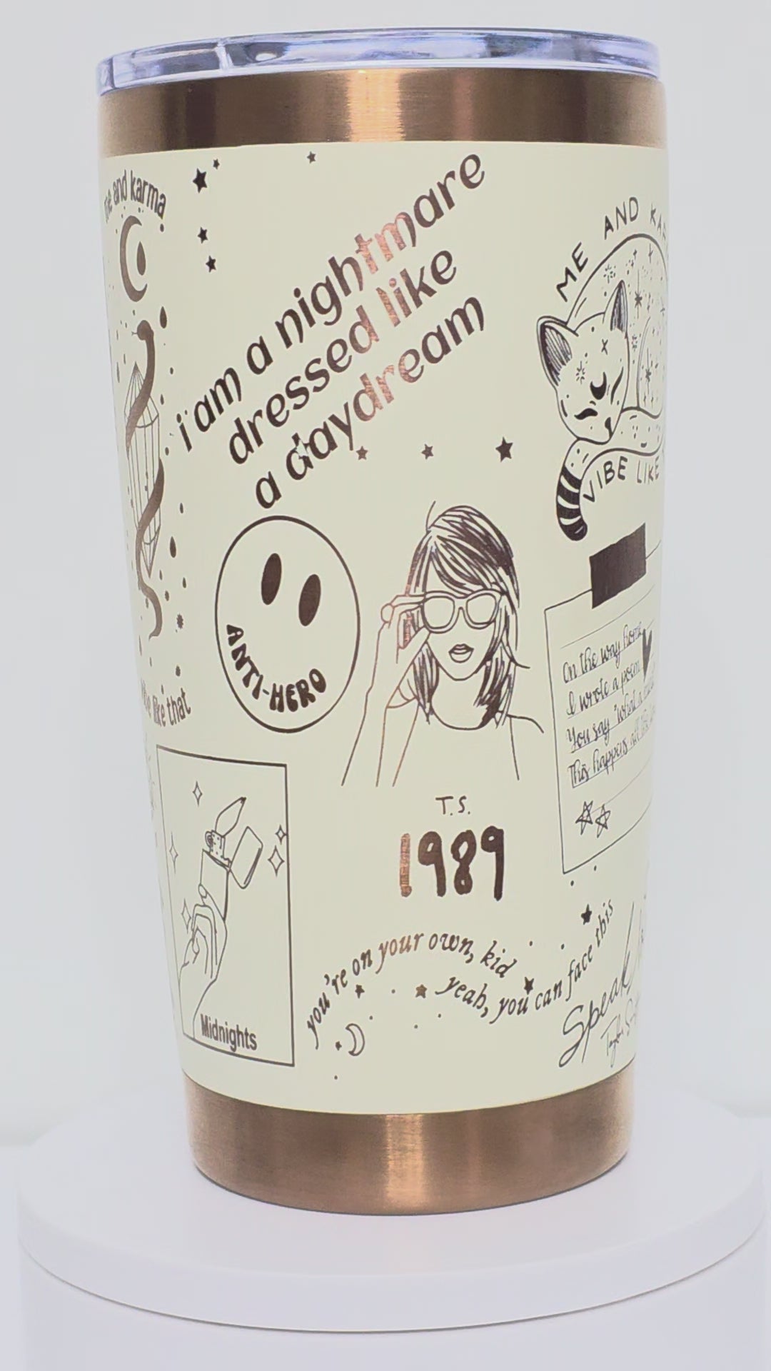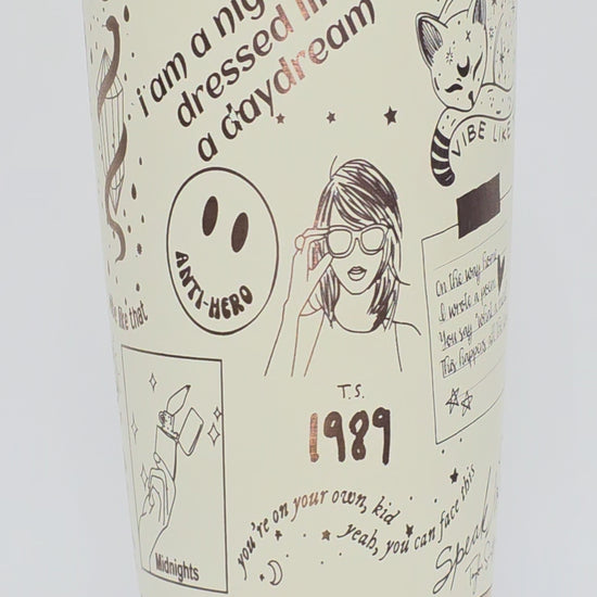 This Taylor Swift–inspired stainless steel tumbler is covered in iconic lyrics, symbols, and Easter-egg designs from multiple eras — from Reputation to Midnights and beyond. Every detail is a love letter to surviving, sparkling, and owning your story.